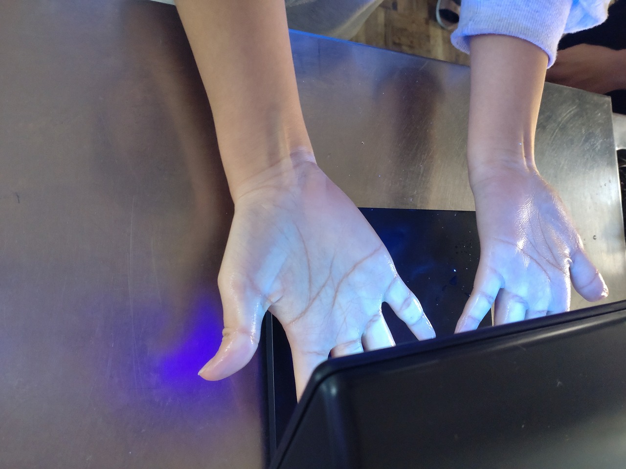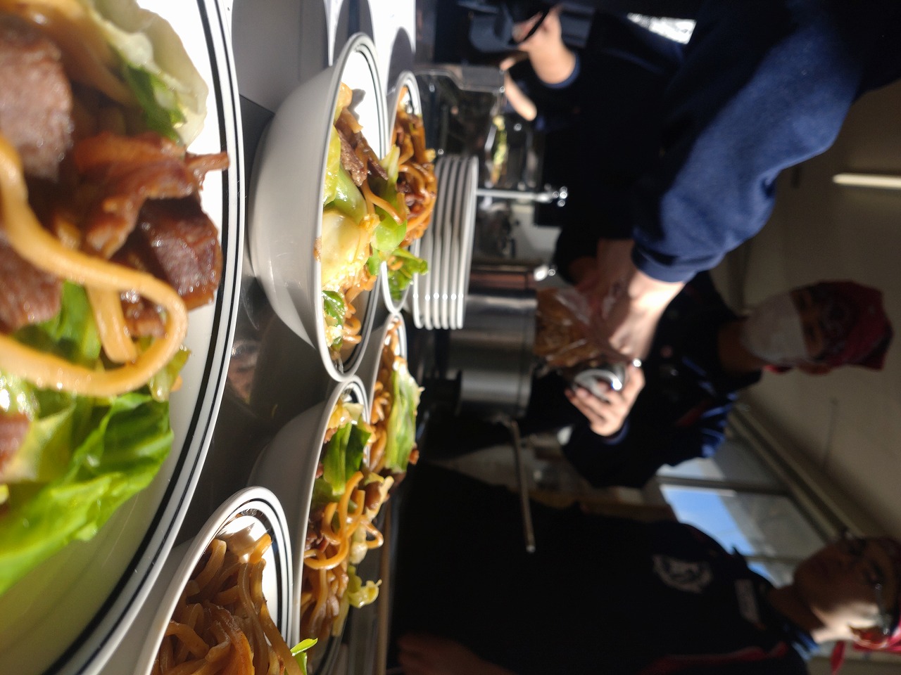 地域のくらしの中の知恵と工夫から生まれたローメンの歴史をお話しいただきました。また、手洗いマスターから、手洗いが十分できているかご指導いただきました。紫外線で光るジェルを塗った手をいつも通り手洗いして、紫外線に当ててみるとよく洗えていないところがわかりました。その後、班ごとに、焼きそば風ローメンとスープ風ローメンの両方を専門家にご指導いただきながら作ってみんなでいただきました。