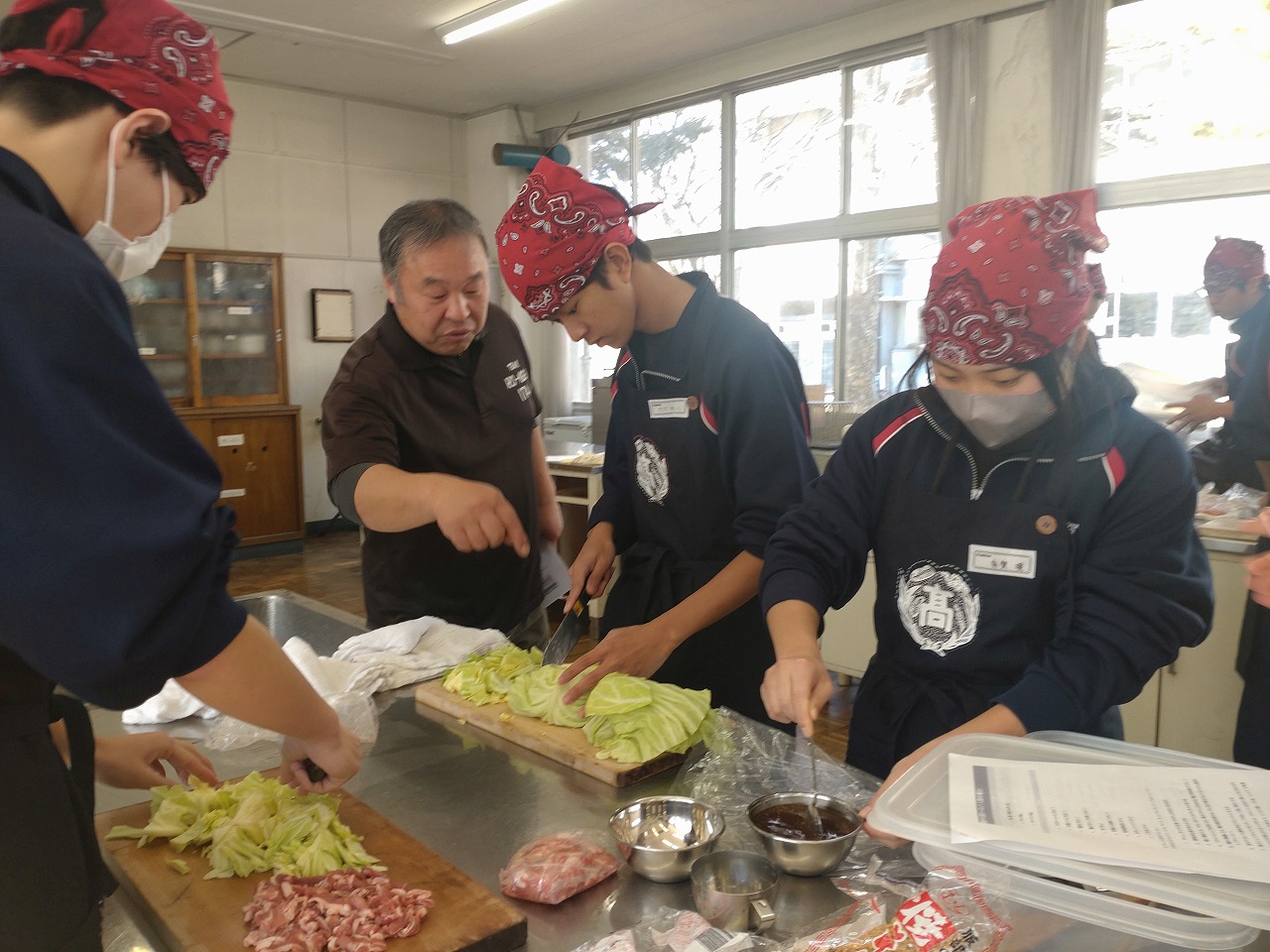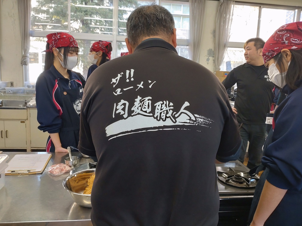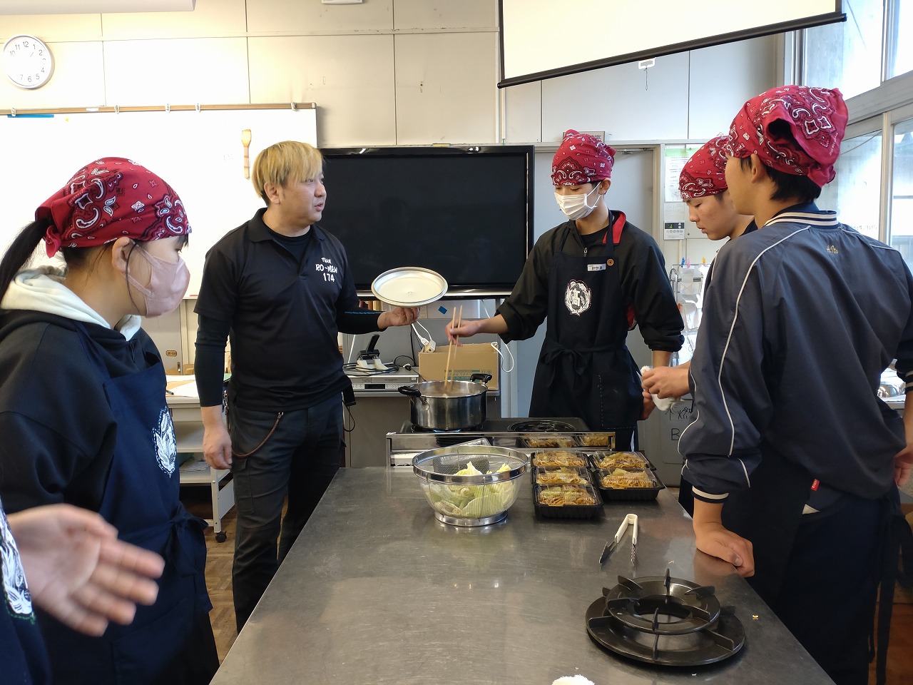 ローメンズクラブ会長で日本料理あすなろ店主の唐澤正也さんに、ローメンについての講習をお願いしたところ、他にローメンズクラブの方3人にお越しいただきました。12月15日に野菜コース、1月16日に果樹コースの食文化の授業で、ローメンの作り方や歴史など教えていただきました。